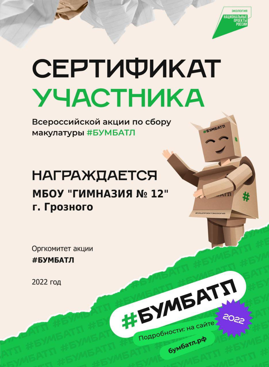Учащиеся и сотрудники МБОУ «Гимназия № 12» г. Грозного приняли участие во Всероссийской акции по сбору макулатуры #БумБатл. Цель Акции - формирование экологической культуры у подрастающего поколения. Напоминаем, что данная акция организуется третий год подряд в поддержку национального проекта "Экология", её участниками стали не только школы, но и детские сады, средние профессиональные и высшие учебные заведения, компании и активисты. Благодарим всех за участие в акции!
