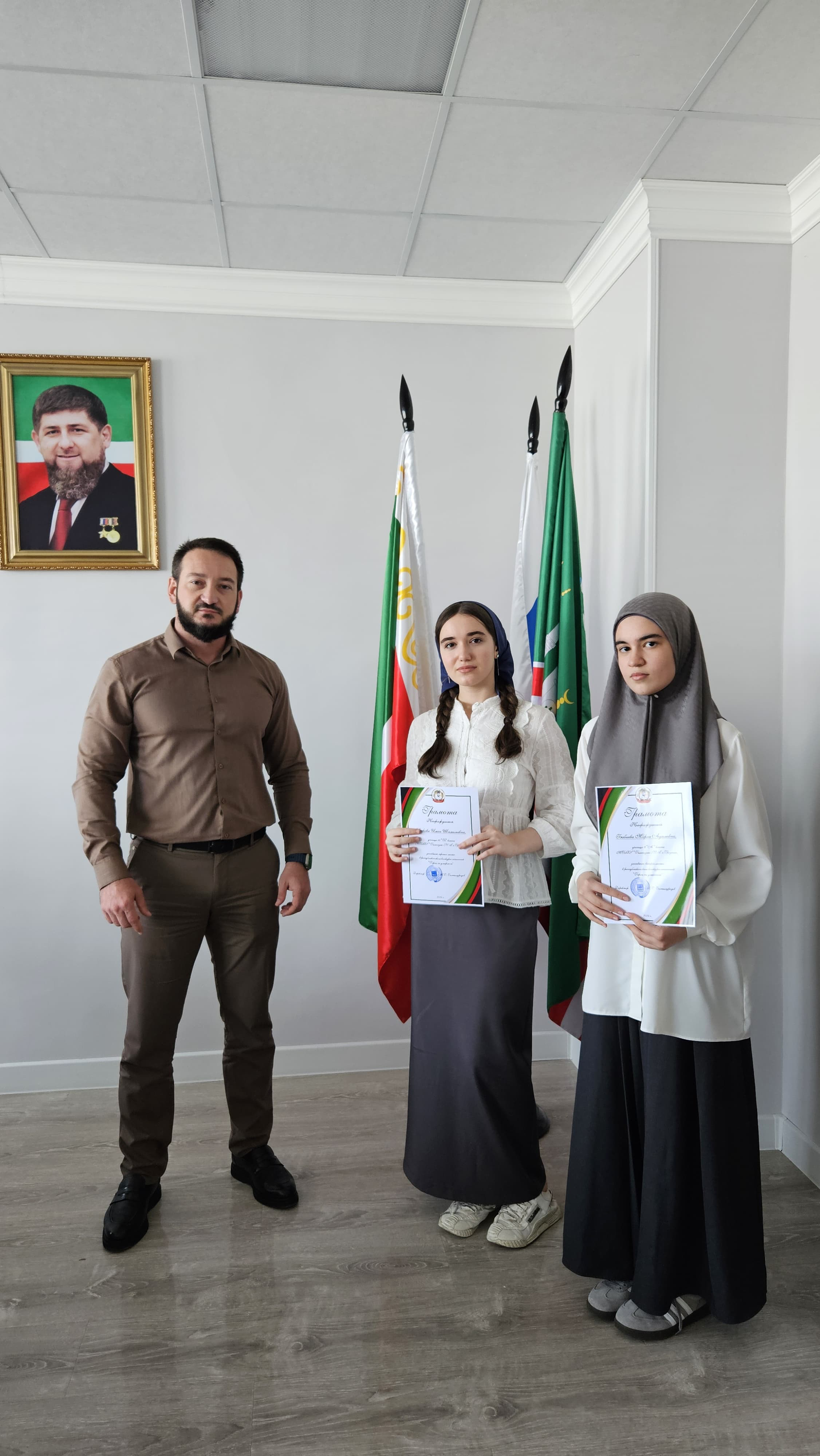 Сегодня мы с радостью отметили талантливых участниц республиканского конкурса сочинений - эссе "Герои не умирают", посвящённого Первому президенту Чеченской Республики, Герою России А. А. Кадырову ученицу 8 класса Бабиеву Марху за II место и Исакову Иман, ученицу 10 класса за III место.