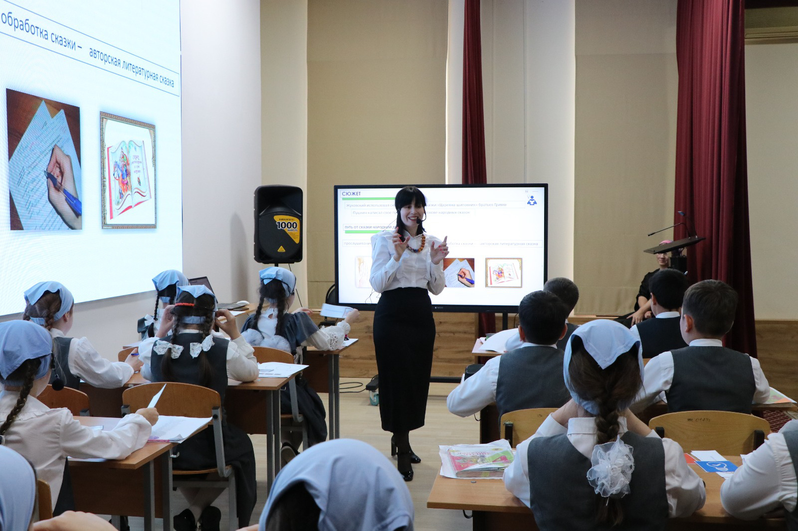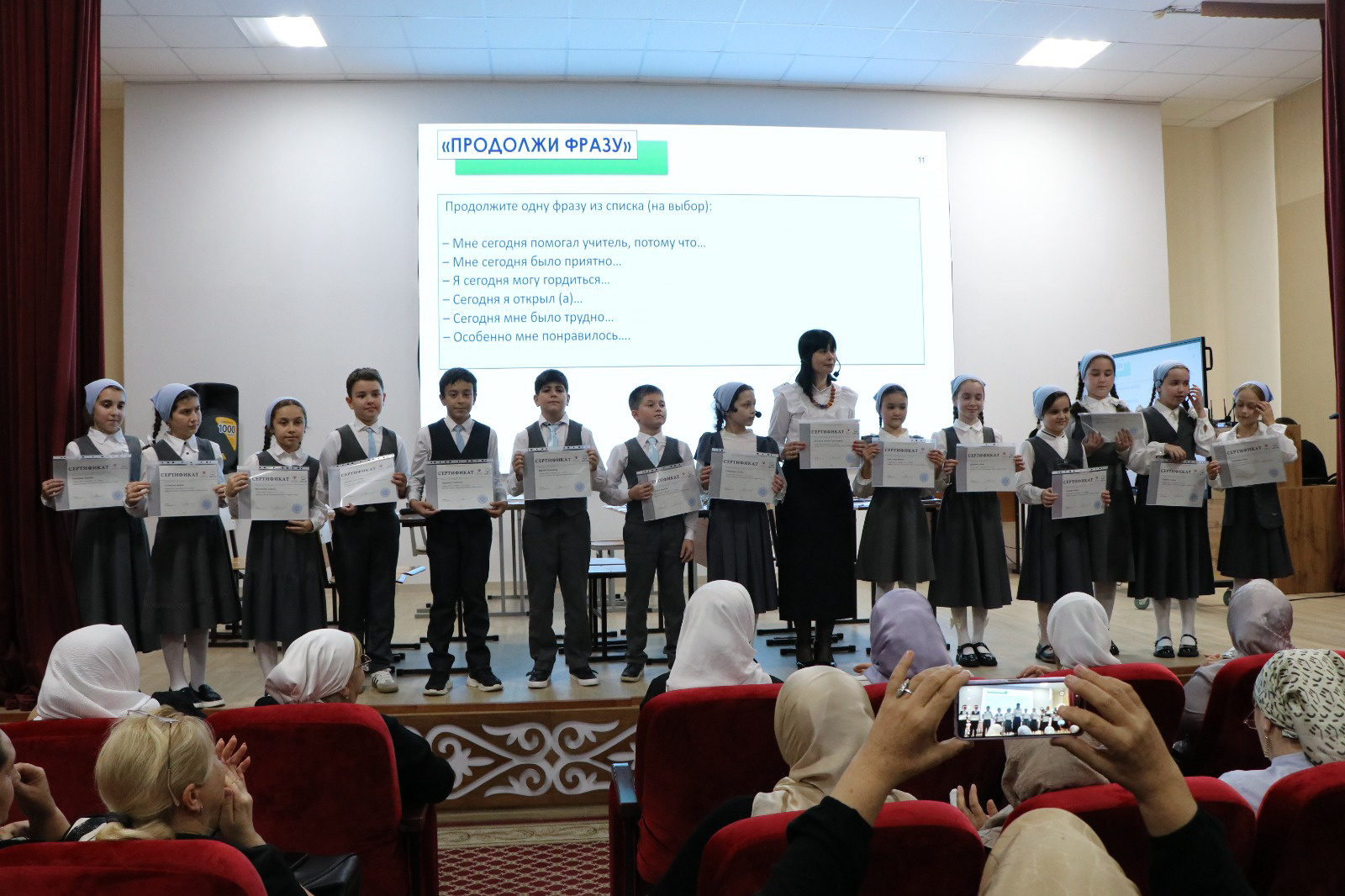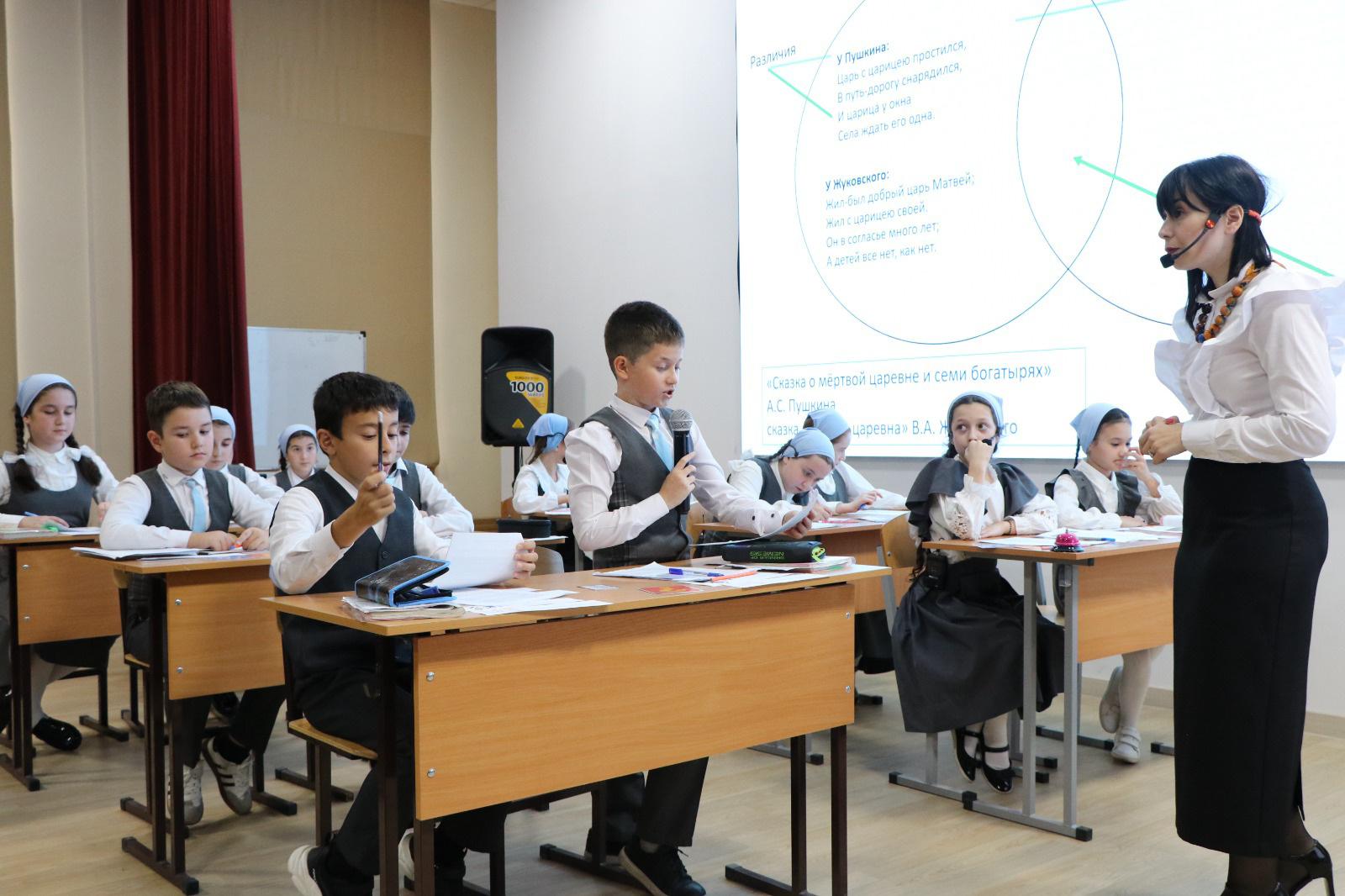 На суд зрителя был представлен урок литературного чтения в 4 классе по теме: «Сходство фольклорных и литературных произведений А.С. Пушкина, В.А. Жуковского по тематике, художественным образом («бродячие сюжеты»).». Урок провела учитель начальных классов МБОУ «Гимназия №12» г.Грозного - Дзугаева Зарета Григорьевна. По завершению занятия педагог провела самоанализ урока, рассказала какой вид деятельности к какому результату относится и с помощью каких методов и приёмов смогла их реализовать. Ученикам и учителю были вручены сертификаты участия в проекте.