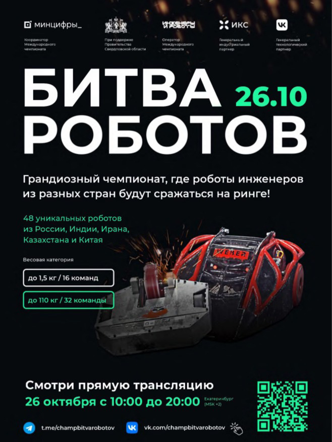 Минцифры России в соответствии с распоряжением Правительства Российской Федерации от 11 апреля 2023 г. № 889-р сообщает о проведении второго отборочного этапа Международного чемпионата по битве роботов , который способствует продвижению инженерной мысли как драйвера развития и поддержки современных цифровых технологий.Второй отборочный этап Чемпионата состоится 26 октября 2024 г. при поддержке Правительства Свердловской области на территории международного выставочного центра «Екатеринбург-Экспо» (павильон № 4) по адресу: г. Екатеринбург, бульвар ЭКСПО-бульвар, 2.Ссылка на прямую трансляцию Чемпионата в сети «Интернет» по адресу: https://vk.com/video-219465931_456240225