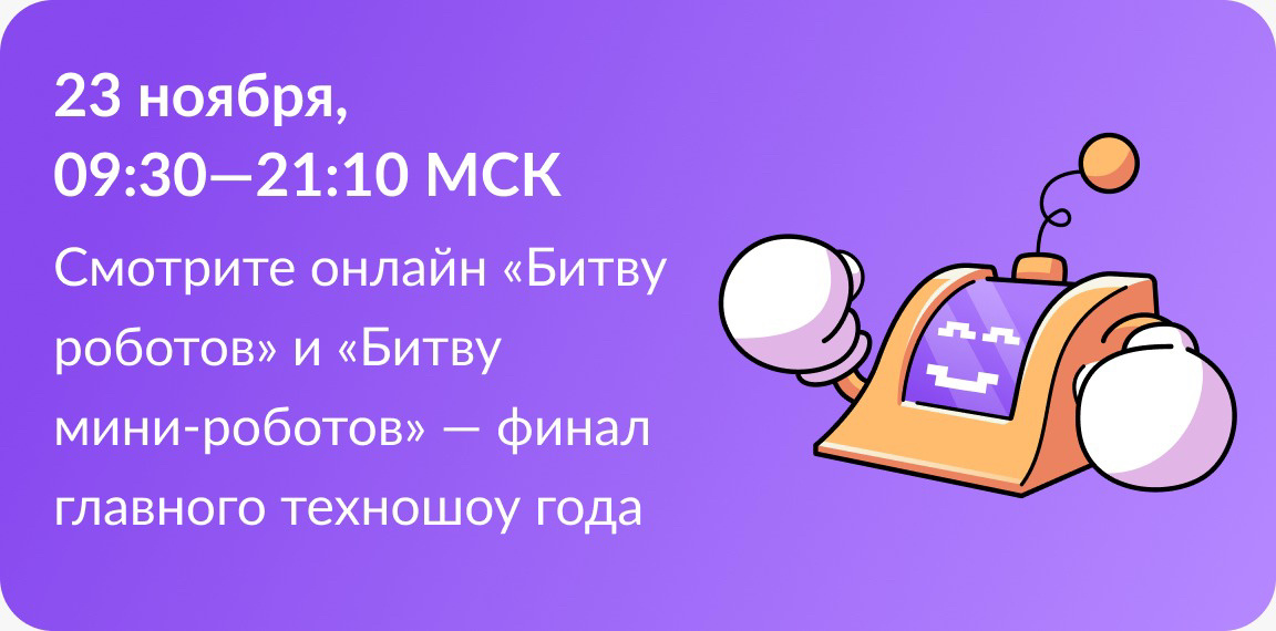 Не пропустите финал главного техношоу года! 🎉 23 ноября с 09:30 до 21:00 МСК смотрите онлайн «Битву роботов» и «Битву мини-роботов»!